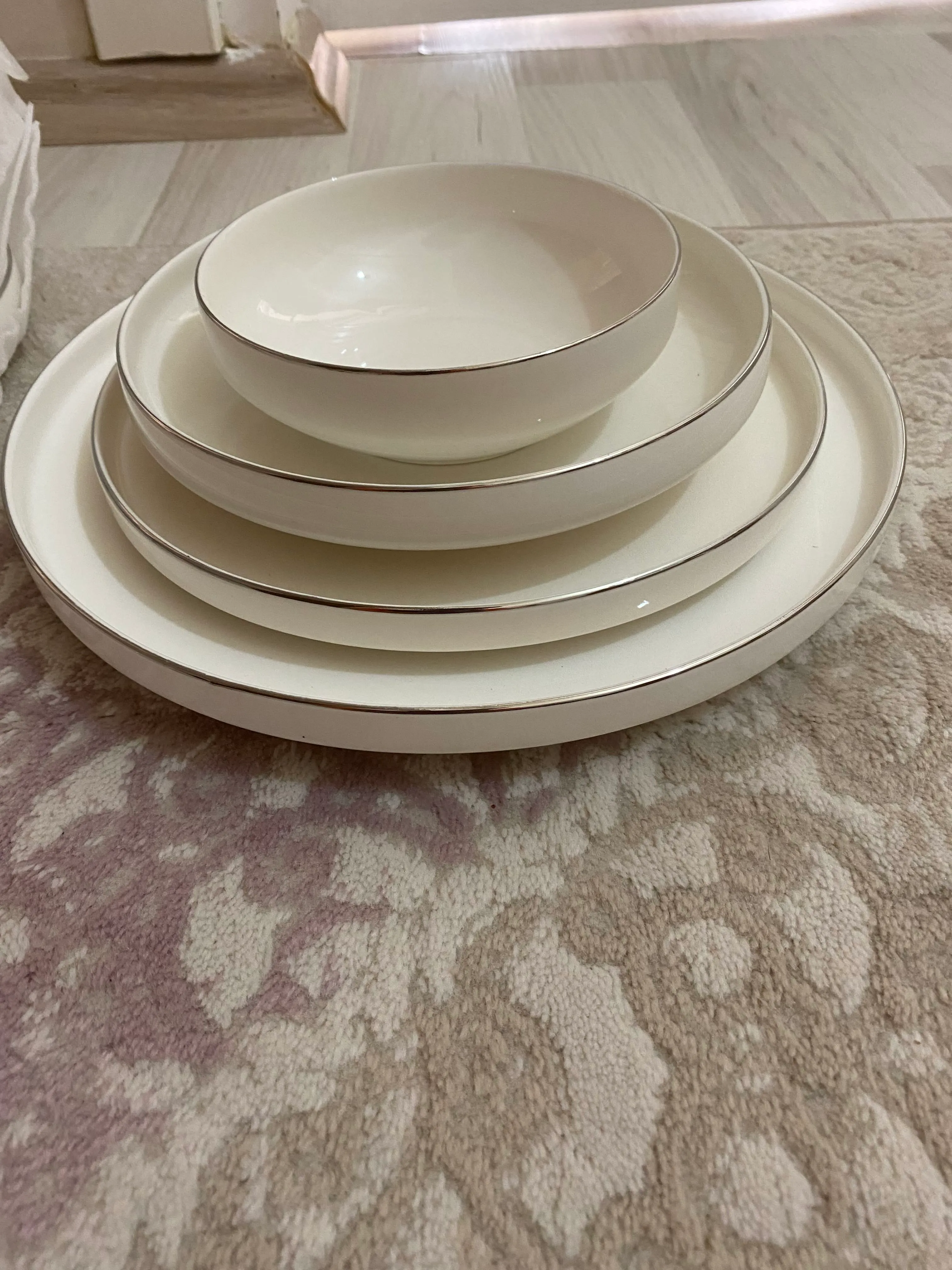 Yemek takımı çok şık ve kaliteli ama fotoğraftaki şekilde kırılmış 2 kenarları dökülmüş olarakta 3 tabak çıktı. Kaselerde ve servis tabaklarında hiç sorun yokken yemek ve tatlı tabaklarımda kırık parçalar var.